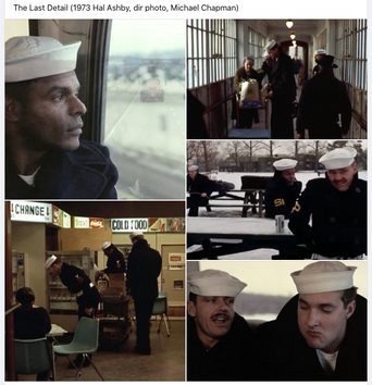 "The Last Detail is a film that was created in 1974 and reflects a time in filmmaking art where the heavier cameras would be placed in the thick of real experience, in this case documenting the actual locations in which the figures would have travelled were they in life rather than in art. We are forced to witness the not always pleasant physical institutions that were created to contain large numbers of people: military bases, city train stations and bus terminals, drab diners and banal bars, public bathrooms, cheap sandwich and pretzel stands, skating rinks, whorehouses housed in the greater Boston area, student/hippie apartments, the cheapest motel - with barely functional cots for beds, and finally, a woodsy park area in the snowy cold Winter, with no people except the three principals - all three of whom seem ill clad for such Winter, shivering in their military issue pea coats and open necked sailor’s uniforms. All of these environments are photographed in the most direct fashion possible, head on, so as to emphasize the brutalist designs of the era.